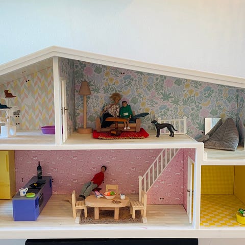 Nukkekodin kalusteita ja ihmisiä. Keittiö, makuuhuone, WC, paljon pientä sälää. Nouto Kuninkaantammi