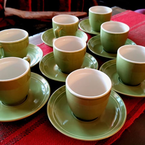 8 kahvikuppia ja 4 teekuppia sekä kermakko ja sokerikulho + yksi murokulho, halk. 13,5