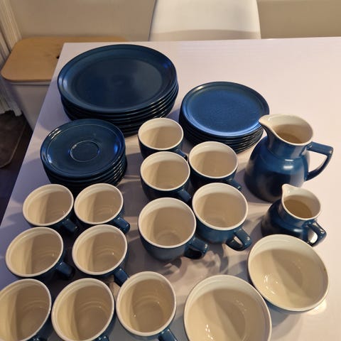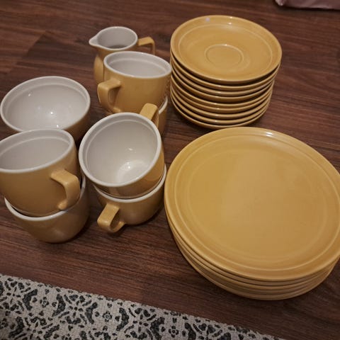 Erittäin hyväkuntoinen okran( keltainen) sävyinen astiasto sis.