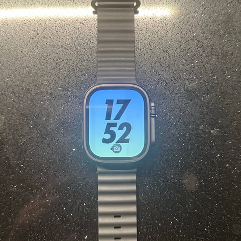 Apple Watch Ultra älykello, jossa suorakulmainen kosketusnäyttö ja digitaalinen kruunupainike. Kellossa on vaalea/valkoinen urheiluranneke, jossa säätöreiät ja metallinen solki. Sopii ranteeseen säädettävän pituuden ansiosta. Älykello tukee ilmoitusten seurantaa ja muita Apple Watch -toimintoja yhteensopivien Apple-laitteiden kanssa.