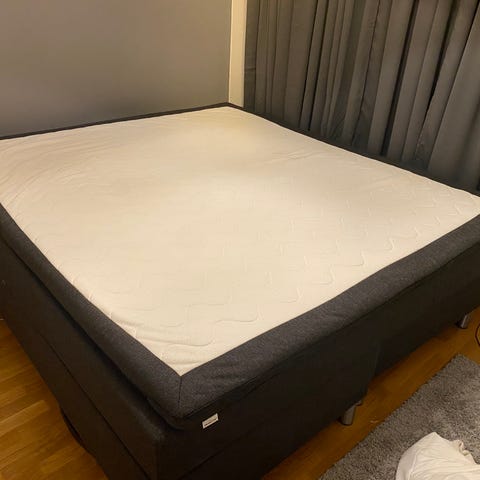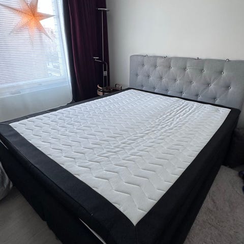 Jysk Dreamzone jenkkisänky tummanharmaalla verhoilulla. Sängyssä on kaksiosainen alarunko ja päällä erillinen joustinpatja, jonka päällä näkyy irrallinen sijauspatja. Korkeus on mitattuna noin 60 cm lattian tasosta patjan yläreunaan. Metallijalat tuovat sängylle lisäkorkeutta ja tukevuutta. Sopii kahden hengen sängyksi makuuhuoneeseen.