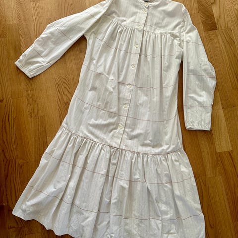 Marimekko kaivo kuosilla. Malli on väljä ja A-linjainen, helmasta levenevä. Hihat ovat puolipitkät ja takana on pieni halkio nappikiinnityksellä. Tahraton ja ehjä. eläimetön koti. 100% puuvilla. Paksumpaa vintage-puuvillaa.