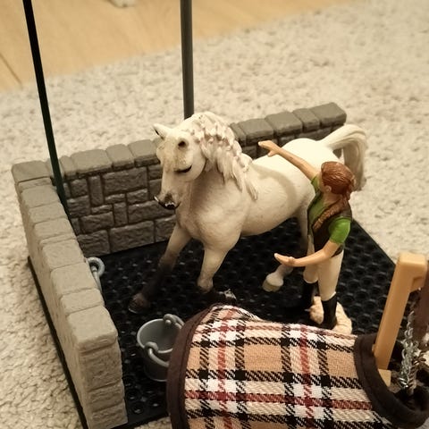 Schleich pesupaikka, hevonen hoitaja satula suitset tarvikkeet