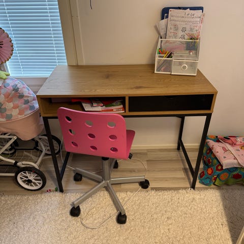 Hyväkuntoinen ja tukeva koulupöytä. Muutamia jälkiä tullut lasten leikeistä, mitkä varmasti lähtevät jykevimmällä aineilla tai uudella maalipinnalla.