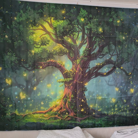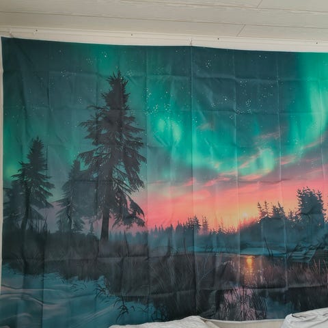 Seinälle tarkoitettu kuva, käy myös verhoksi. Materiaali polyesteria, koko n. 180 cm korkeus, leveys n. 240 cm.