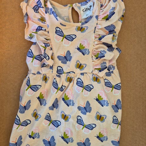 Ihana vauvan kesämekko Ciraf -merkiltä. Röyhelöhihat ja niskassa kaunis aukko nappikiinnityksellä. Kokomerkintä 62, mutta menee pitkälle 68 kokoon asti. Lähes uutta vastaavassa kunnossa!