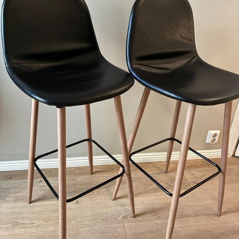 Ehjät ja siistit korkeat tuolit. Joitain haaleita käytön jälkiä/tummentumia tuolin päällyksessä. Tuolin mitat: Leveys: 43 cm, Korkeus: 105 cm, Syvyys: 45 cm