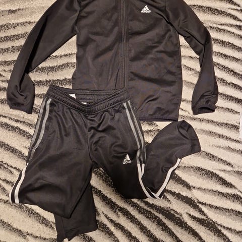 Adidas verkkaripuku lapsille, koko 134. Noin 11-12 v .Kaksiosainen asu, johon kuuluu vetoketjullinen takki ja pitkät housut. Väri musta, sivuilla Adidaksen tunnusomaiset kontrastiraidat ja rinnassa sekä lahkeessa logo. Sopii arkeen ja liikuntaan lapselle, jonka pituus on noin 134 cm.