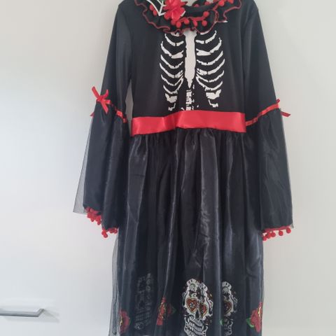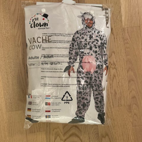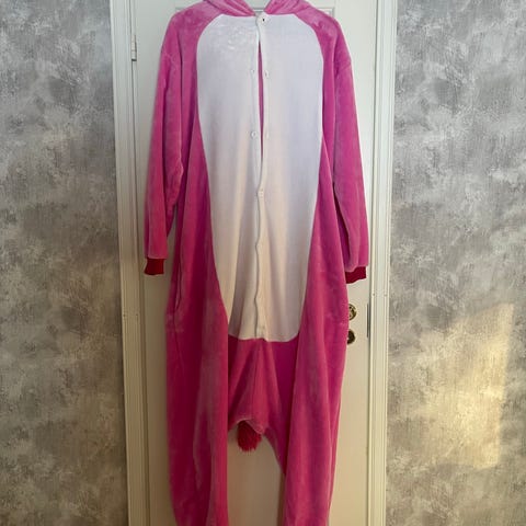 Penkkariasuna tai naamiaspukuna koirahaalari. Koko XL. Alkuperäiseen pukuun on eteen harsittu valkoinen kangas liian räikeän pinkin tilalle, mutta sen saa helposti irrotettua halutessa. Mukaan itse tehty panta ja hanskat.