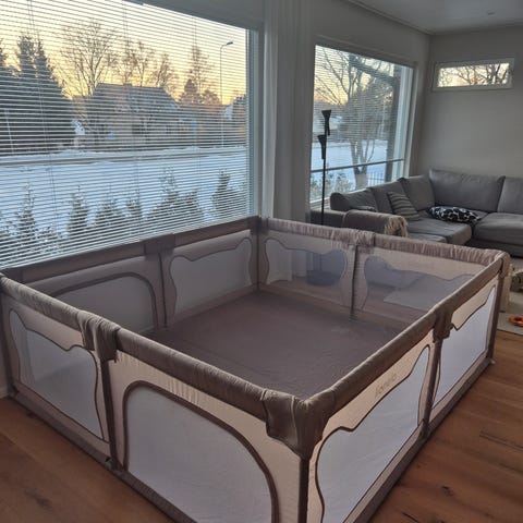 Puinen leikkikehä, jossa paljon käytön jälkiä. Brio-merkkinen kai. Saa säilytystä varten taitettua kasaan.