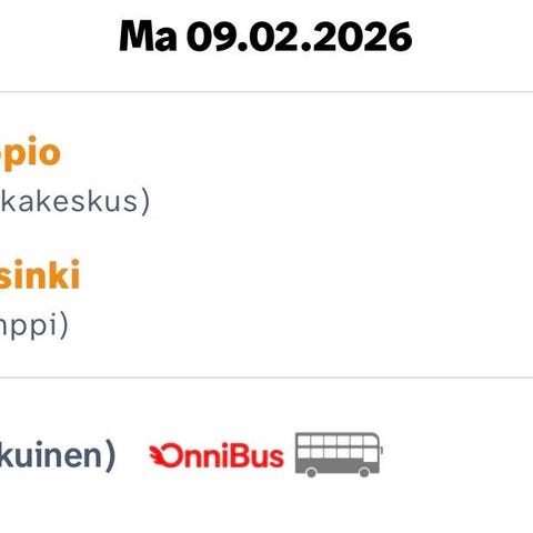 OnniBus bussilippu reitille Helsinki–Jyväskylä perjantaina 27.02.2026. Lähtö Helsingistä ja saapuminen Jyväskylän matkakeskukseen. Lippu on aikuiselle matkustajalle.