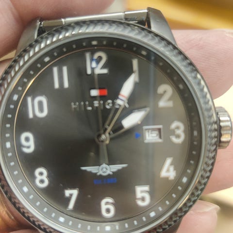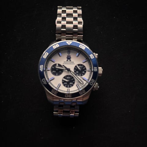 Tommy Hilfiger miesten rannekello metallirannekkeella. Kellossa on pyöreä kellotaulu ja useita pienempiä apunäyttöjä. Ranneke ja kuori ovat metallia, väriltään teräksen sävyisiä. Kellotaulu on tumma, ja siinä on selkeät indeksit sekä numeromerkintä klo 12 kohdalla. Mukana alkuperäinen Tommy Hilfiger -kellorasia ja käyttöohjeet.