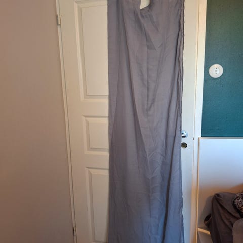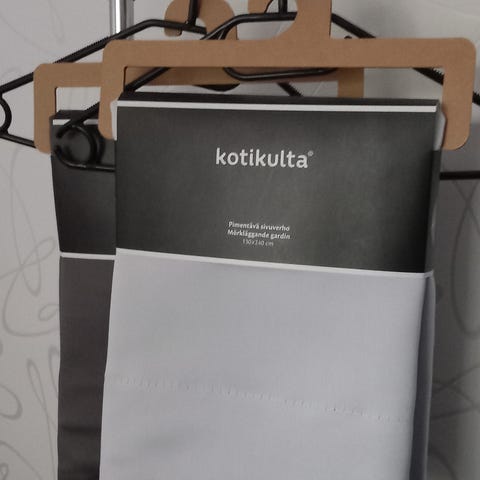 Musta verho tähtikuvioinnilla. Sopii ikkunaverhoksi tai huoneen pimentämiseen ja sisustuksen yksityiskohdaksi. Kuvioina erikokoisia tähtiä ja pisteitä, jotka kulkevat pituussuunnassa verhon keskellä ja reunoilla. Materiaali vaikuttaa sileältä ja laskeutuvalta kankaalta. Soveltuu käytettäväksi esimerkiksi olohuoneessa tai makuuhuoneessa yksivärisenä, kuviollisena sisustuselementtinä.lev.75cm pit.166cm