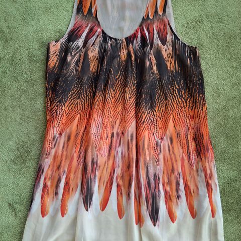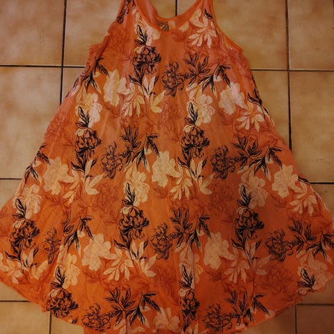 PELLAVA esämekko naisille, koko XXL. Mekko on oranssi, jossa on vaalea kukkakuviointi. Materiaalina pellava, joka on hengittävä ja kevyt. Hihaton malli, jossa on väljä ja ilmava leikkaus. Sopii käytettäväksi esimerkiksi kesäpäivinä ja rennossa arkipukeutumisessa.