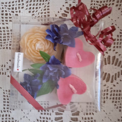 Kynttilät korissa ystävälle! Kaksi sydäntä ja yksi pionin kukka. Valmiiksi lahja pakkauksessa. Hinta 8€.