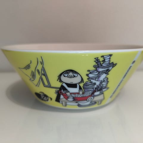 Arabia Muumi kulho, jossa maisemakuvio ja Muumi-hahmoja sisäpuolella. Kulho on valkoinen, ja siinä on mustalla piirretty maisema sekä värillisiä yksityiskohtia. Pohjassa on Arabia- ja Muumi-leimat.