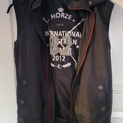 Käyttämättömäksi jäänyt topparatsastusliivi, koko 176cm. Vetoketjulliset taskut ja sisäpuolella vetoketjullinen tasku ja tarratasku. Vetoketju ja painonapitus. 100% polyester. ToriDiili postitus.