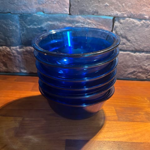Kaksi Iittalan sinistä lasikulhoa, Jalallisen kulhon läpimitta noin 11 cm ja toisen noin 12,5 cm. Hyvässä kunnossa, jääneet käyttämättä. Myydään yhteishintaan Toridiilinä.
