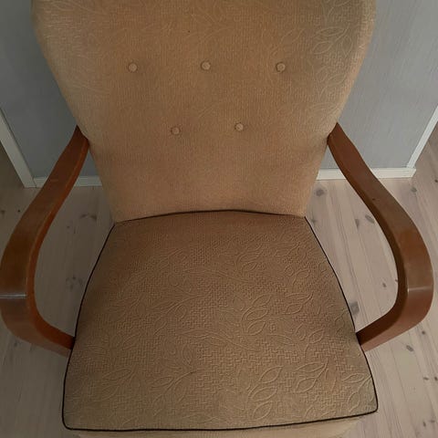Siistikuntoinen puurunkoinen nojatuoli jossa istuinosassa jousitus jossa on gobeliinikankainen verhoilu. Tukeva istua! Vain nouto.