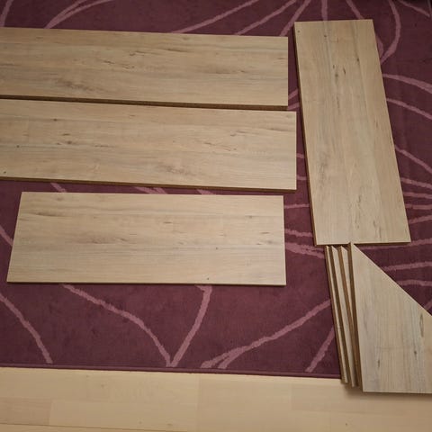 Annetaan erikokoisia jämäpaloja välitila- ja työtasolevyistä.