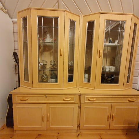 Vitriini kaappeja laisiovilla 3 kpl 100cm leveitä ja 2 kpl 40 cm leveitä. Kaisissi korkeus 92 cm ja syvyys 30,5 cm oven kanssa. Voidaan kiinnittää seinälle. Tai pitää lattialla. Yhteis pituus 360cm. Kaikissa komme hyllyä. Kuljetus järjestyy. Kaikki yht. 300e