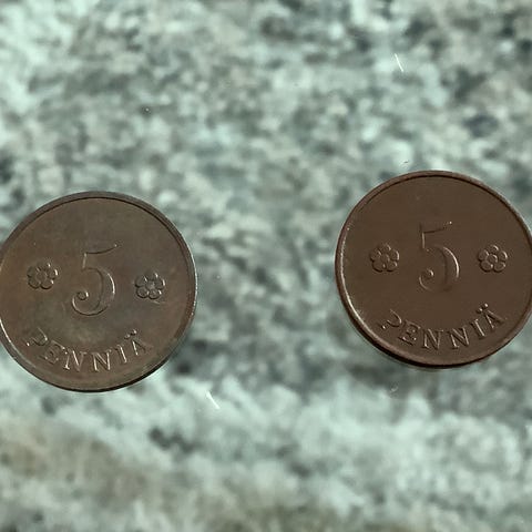 Katso kuvia. Nyt on jo todella vanha yksi penni. Huimaa tuo vuosiluku. Vanha penni on kuparia.