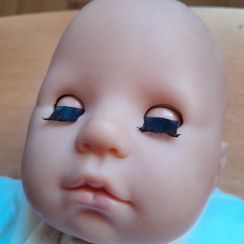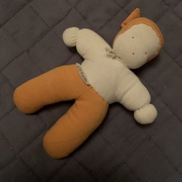 Pehmeävartaloinen chou chou vauvanukke ja toinen potkupuku ja nokkamuki.
