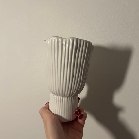 Ellos maljakko vaaleaa keramiikkaa. Maljakossa on uurrettu pinta ja hieman levenevä yläosa. Sopii esimerkiksi leikkokukille tai kuivakukille sisustuselementiksi eri tiloihin. Väri on vaalea, pinnaltaan mattamainen. Korkeus 22cm.