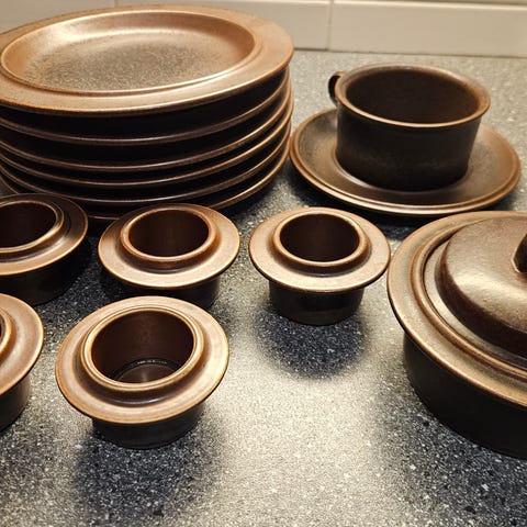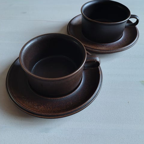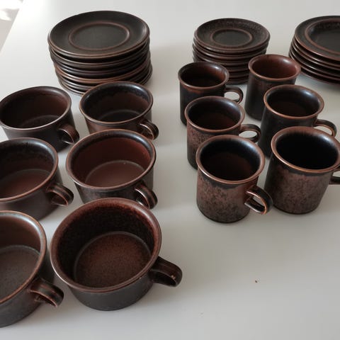 Arabia Ruska kahviastiasto ruskeaa keramiikka, suunnittelija Ulla Procope. Kokonaisuus jossa 6 kahvikuppia, 6 aluslautasta ja 9 kpl pullalautasia sekä 1 kol tarjoilulautanen. Materiaalina lasitettu keramiikka, sävy tummanruskea Ruska sarjalle tyypillisellä eläväpintaisella viimeistelyllä. Sarja on hyvässä kunnossa, katso kuvista yhden kahvikupin lautasen pohjassa oleva pieni päällepäin näkymätön lohkeama.