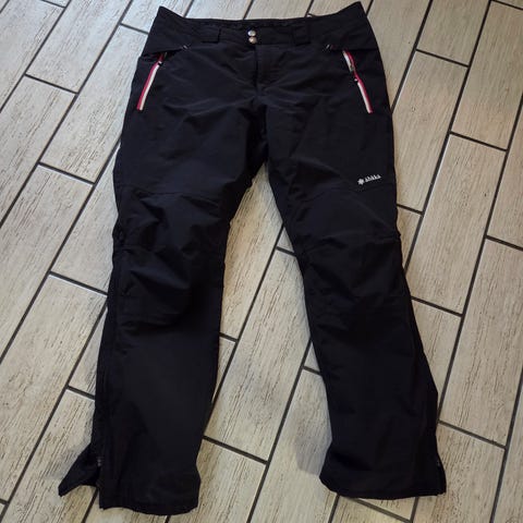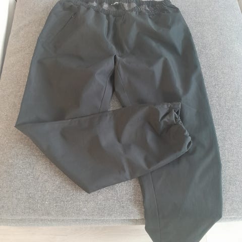 Käyttämättömät Ahkkan mustat kuorihousut. Kuvien sävyerot johtuvat kuvaussuuntien vaihdosta, housut ovat tasaisen mustat. Housuissa on vetoketjulliset sivutaskut ja lahkeet on mahdollista sulkea tiiviisti kengän ympärille tarrakiinnityksellä. Housut avataan sivussa olevasta vetoketjusta. Kangas ja saumat ovat luonnollisesti alkuperäiskunnossa.