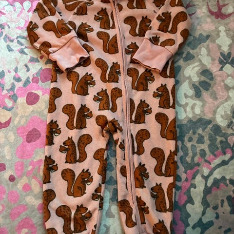 MyWear fleecehaalari tytöille, koko 86. Materiaalina pehmeä fleece. Haalarissa on kauttaaltaan kirjava kuosi, jossa on hevos- ja kukkakuvioita vaalealla pohjalla. Edessä vetoketju. Hihansuissa ja lahkeissa on joustavat resorit. Kunto hyvä, kankaan pinnan kunto näkyy hyvin kuvissa.