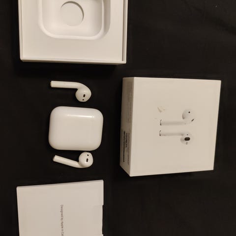 Apple AirPods gen 2 langattomat kuulokkeet valkoisena. Mukaan toimiva latauskotelo. Vasen kuuloke on oikeaa reippaasti vaimeampi. Tarvitsevat siis korjausta. Sopivat myös varakuulokkeiksi, jos äänen tasapainolla ei ole niin isoa merkitystä.