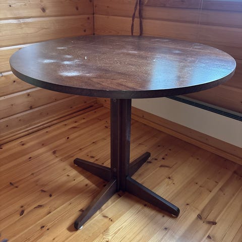 Lahden naulakon valkoinen pyöreä pöytä, kork 55 cm halk 50 cm. Kannessa pieniä siirtelyjälkiä,pinta sinänsä ehjä. Muuten käyttökulumaa.