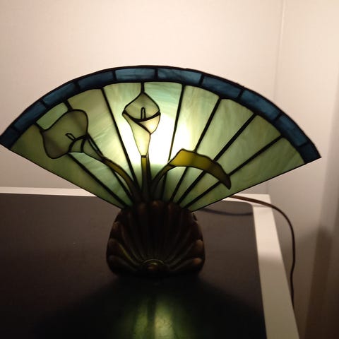 tiffanylasia (= lyijylasityötä), painava jalkaosa on mattalakattua patinoidun messingin väristä metallia, kunto mint, h. 100,-
