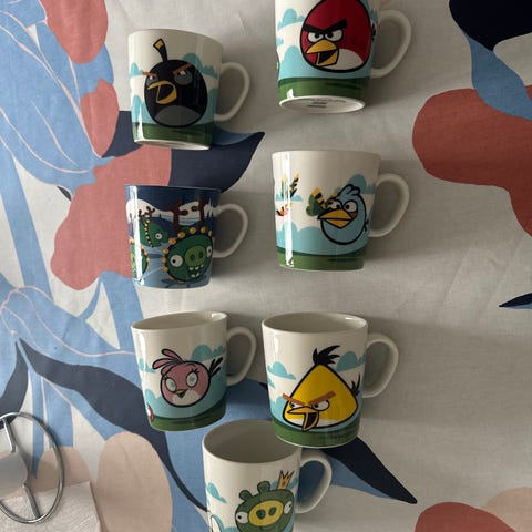 Arabia Angry Birds mukit. Vasemmalla isompi muki, 3dl? Muut 2,5dl.