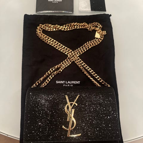 YSL blloger limited edition nahkainen laukku naisille. Tosi harvinainen ja söpö. Etupuolella on värikäs LOVE-kirjailu tähti- ja kuviokoristein. Laukussa on pitkä olkahihna ja vetoketjusuljenta. Sivussa on suuri nahkainen tupsukoriste metallisella YSL-riipuksella. Sisäpuolella on nahkavuori ja useita korttipaikkoja tai pikkutaskuja pienten tavaroiden säilytykseen. Sopii esimerkiksi arjen peruslaukuksi tai iltalaukuksi. Koko: 11x14x5 cm. Mukaan tulee säilytys pussi.