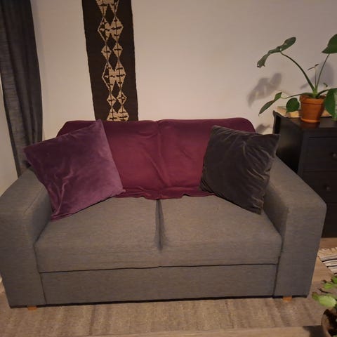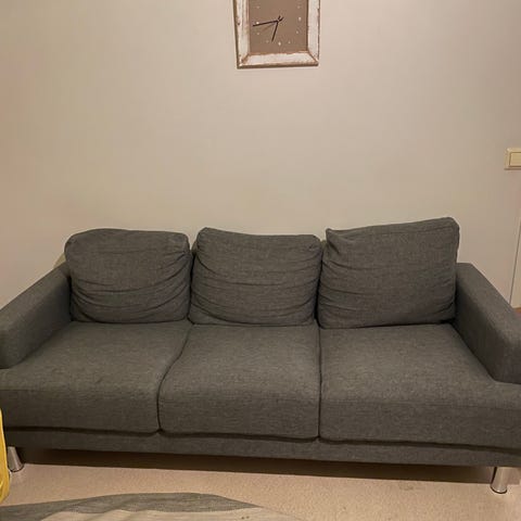 Lahden istuttava harmaa sohva. Palvellut hyvin. Myydään muuton tieltä. Alhaalla pieni paikkaus. Arjessa ei huomaa, on niin alhaalla. Koiratalous.
