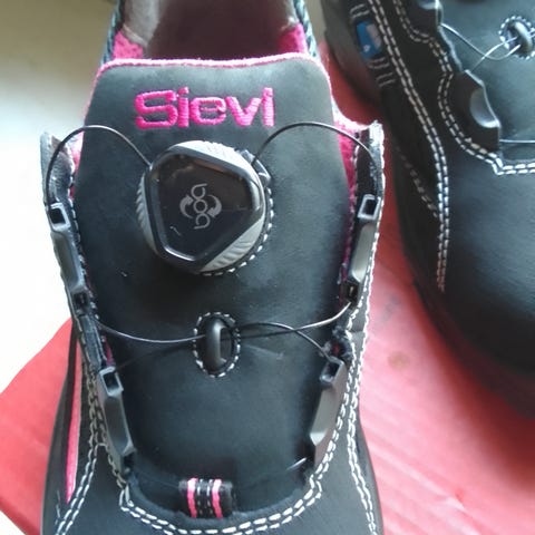 Sievi työjalkineet, koko 37. Mustat matalavartiset kengät, joissa roosat yksityiskohdat ja kontrastitikkaukset. Kiinnityksenä Boa-kiristysjärjestelmä, joka mahdollistaa tarkan ja tasaisen istuvuuden ilman perinteisiä nauhoja. Päällinen kestävää materiaalia, pohja karkea ja pitävä. Sopivat esimerkiksi työkengiksi tai muuhun käyttöön, jossa tarvitaan tukevia ja helposti jalkaan laitettavia jalkineita. Kengät ovat uutta vastaavassa kunnossa.