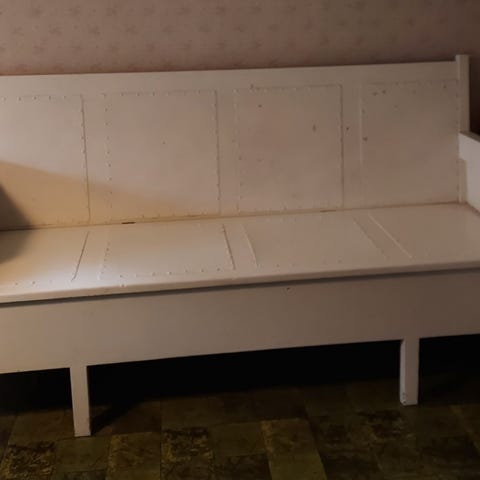 Kokopuinen kulmapenkki säilytyslaatikoilla. Harvinaisempi kapistus!! Elämää nähnyt, maalipinta on muutamassa paikassa kärsinyt. Olen itse verhoillut ja maalannut n. 5v sitten. En tiedä alkuperää, mutta hieno on ja toimii hyvin keittiössä. Mukaan tulee 2 verhoa samaa kangasta. Sohvan koko 150×190cm. Sohvan voi purkaa 3 osaan. Mahtuu hissiin täällä päin.
