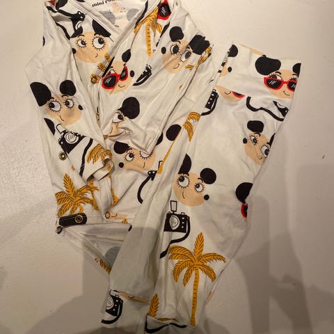 Mini rodini housut ja body. En saa selvää kokolapusta, mutta meillä olleet käytössä 62/68.