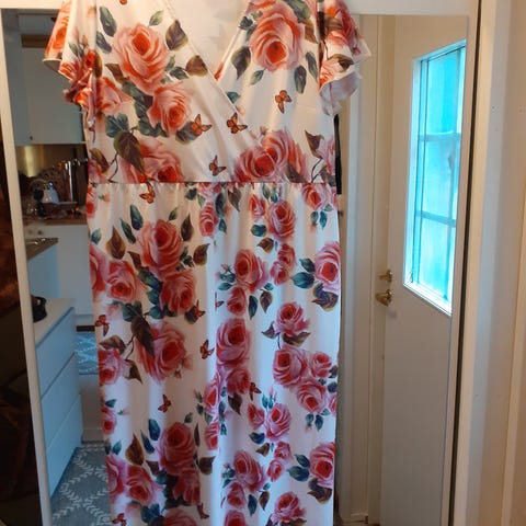 Mango kesämekko, koko L. Naisten pitkä, kirjava kukkakuosinen mekko, jossa on puolipitkät hihat ja vyö samalla kankaalla. Vyön saa irti. Materiaali on puuvillaa. Sopii arki- ja vapaa-ajan käyttöön lämpimiin säihin.