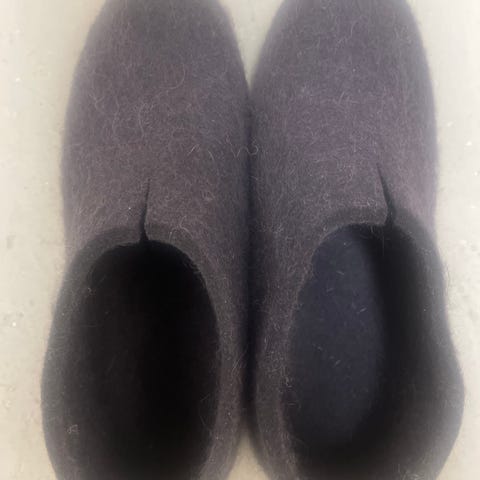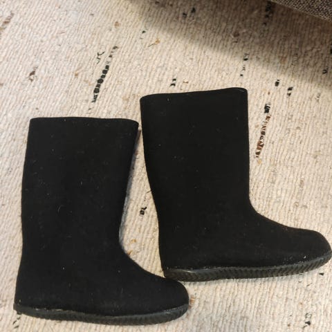 Hyväkuntoiset mustat huopikkaat, joihin teetätetty suutarilla pari talvea sitten pohjat. Liimaus täysin kiinni, yksittäisessä kohdassa liima jäänyt hieman näkyviin pohjan alta. Reunassa ohut punainen koristetikkaus.