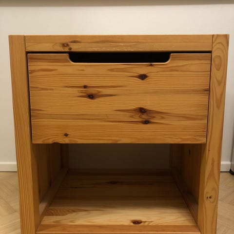 IKEAN valkoinen yöpöytä, puukansi mäntyä. Elämisen jälkiä näkyy puukannessa. Helppo siistiä pienellä hiomisella.