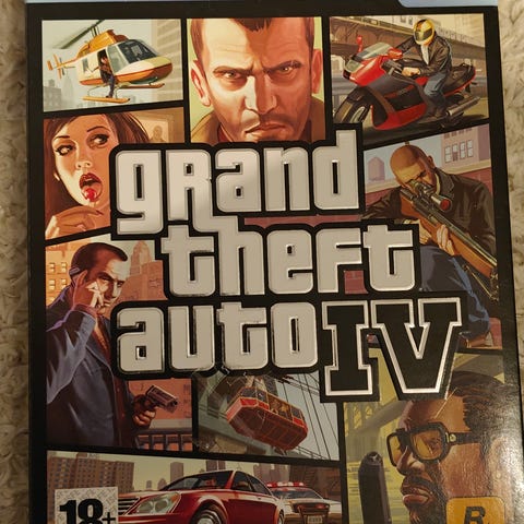 Rockstar Games Grand Theft Auto IV PC-peli DVD-levyinä. Games for Windows -versio, ikäraja PEGI 18. Pakkaus sisältää pelilevyt kotelossa sekä painettuja lisämateriaaleja, kuten oppaan ja karttoja Liberty Citystä. Peli on tarkoitettu pelattavaksi PC:llä DVD-asemaa käyttäen.