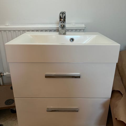 Kylpyhuoneen allaskaappi, jossa valkoinen pesuallas ja puunsävyinen kaappirunko. Allas on tasomallinen, ja siinä on hanareikä sekä ylivuotoaukko. Kaapissa on etupuolella vetolaatiko säilytystä varten. Soveltuu asennettavaksi kylpyhuoneeseen tai wc-tilaan.L62 S 40 Uutta vastavaa Ollut asennettu ja noin viikon käytössä Kahva ei ole mukana