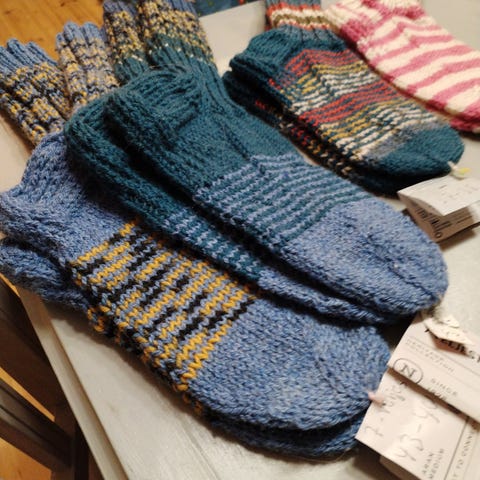 Huovutetut lakit, kaksi kappaletta. Toinen lakki on punainen ja toinen musta, molemmissa on vastavärinen koristekirjailu helmassa sekä kaksi pitkää, ylös nousevaa tupsullista nauhaa. Materiaalina näyttää olevan villa tai villasekoite, huovutettu ja lämmin. Sopii esimerkiksi joulun ajan käyttöön tai naamiaisasuun. Koko ei käy ilmi, mutta malli vaikuttaa sopivan useimmille aikuisille tai isommille lapsille joustavan reunan ansiosta.