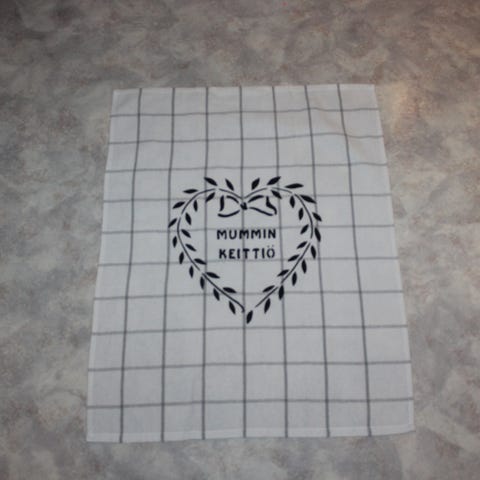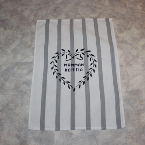 Uusi n.50x70cm keittiöpyyhe/leivinliina, käsinpainettu sydän kuva ja mummun keittiö teksti.