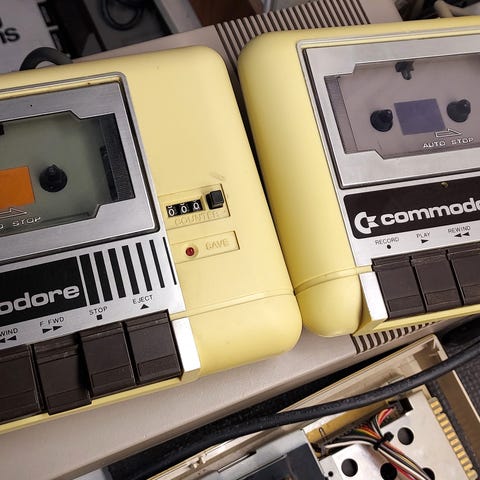 Commodore kasettiasema tietokoneelle. Laitteessa on kasettipesä, ohjauspainikkeet ja virtaliitäntä. Sopii Commodore-tietokoneiden ohjelmien ja pelien lataamiseen kaseteilta.