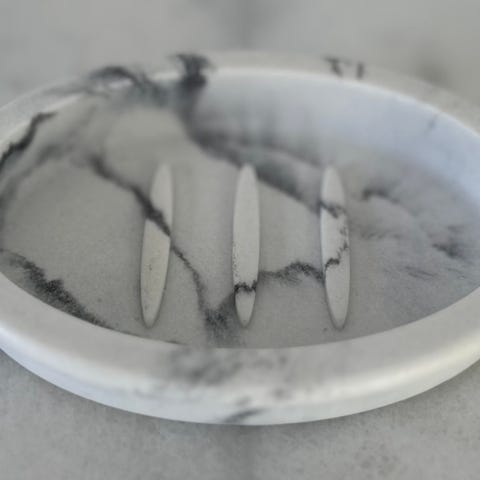 Marmorinen saippuan alusta. Väri valkoinen marmorikuvioinnilla. Soikea muoto ja uritettu sisäpinta, joka auttaa pitämään saippuan kuivempana. Soveltuu kylpyhuoneeseen tai keittiöön palasaippuan säilytykseen.