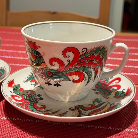 Lomonosov teekuppisetti koostuu useista posliinisista teekupeista ja aluslautasista. Astioissa on valkoinen pohjaväri, sininen kuviointi ja kultaiset koristeet reunoissa ja kuvioissa. Setti soveltuu kahvin tai teen tarjoiluun arki- ja juhlakäyttöön. Posliinimateriaali on kovaa ja sileää, ja kupit sekä lautaset ovat muodoltaan perinteisiä pyöreitä malleja korvalla varustettuine kuppeineen.